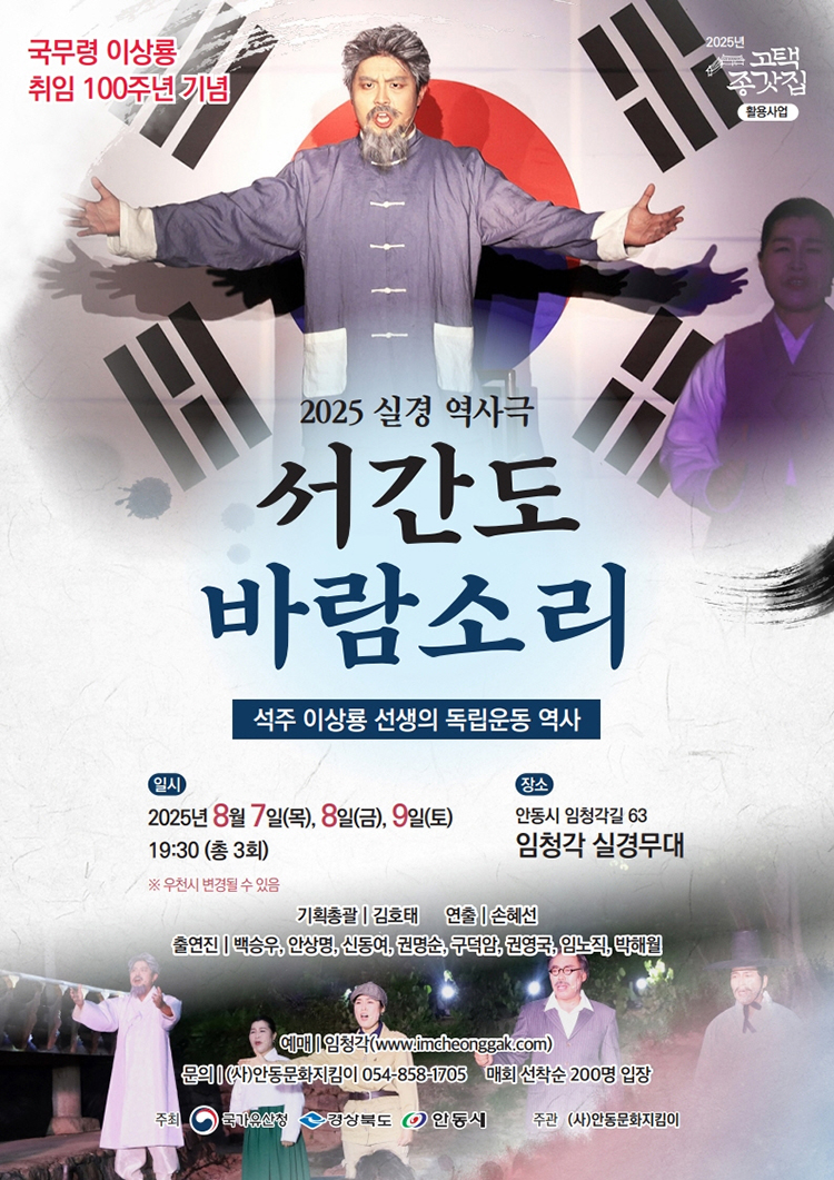 안동시는 오는 8월 7일부터 9일까지 사흘간, 매일 저녁 7시 30분 임청각 일원에서 독립운동 실경 역사극 ‘서간도 바람소리’를 개최한다고 밝혔다. 이번 공연은 대한민국 임시정부 초대 국무령 이상룡 선생의 취임 100주년을 기념해 기획됐으며, 누구나 무료로 관람할 수 있다.
