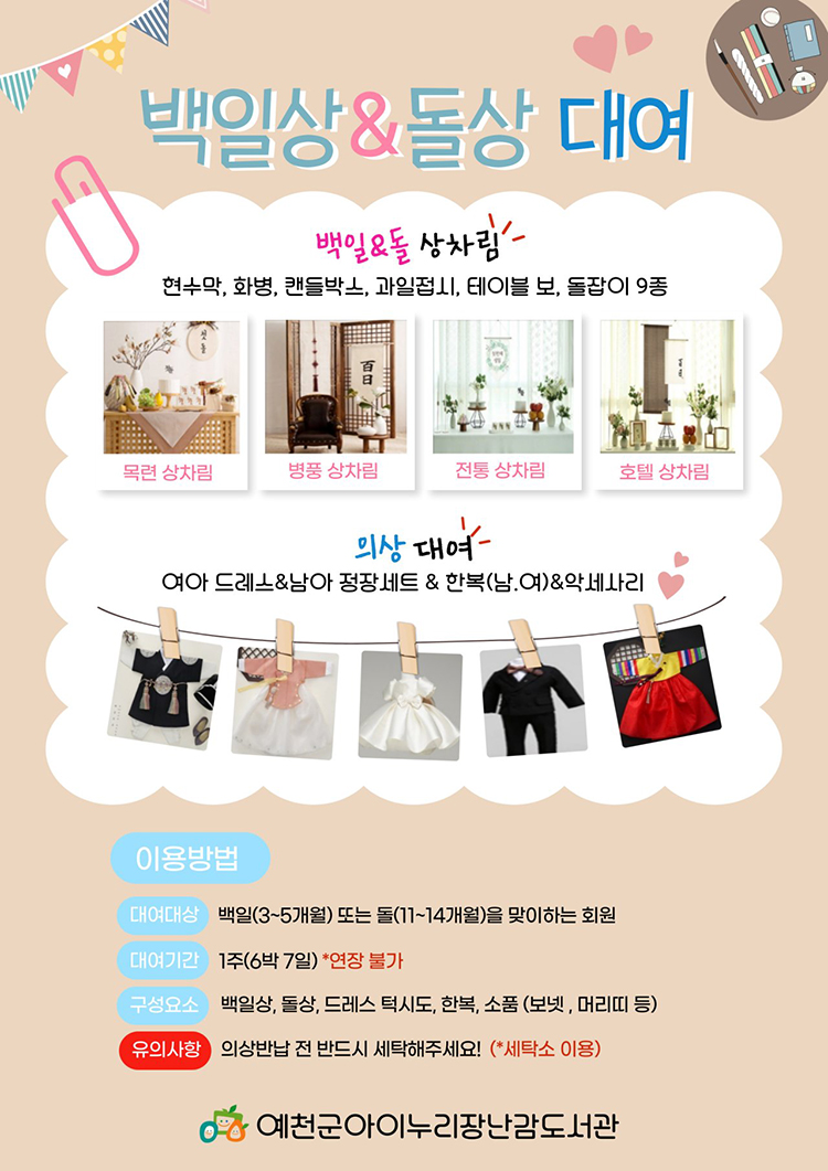 경북 예천군 아이누리장난감도서관(관장 박미경)이 자녀 양육 가정의 경제적 부담을 덜어주기 위해 ‘백일상&돌상 대여 서비스’를 새롭게 시작해 눈길을 끈다.