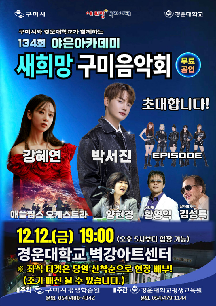 구미시는 오는 12일 오후 7시 경운대학교 벽강아트센터에서 '제134회 야은아카데미' 특별 공연을 개최한다고 밝혔다. 이번 행사는 '새희망 구미음악회'를 주제로, 연말을 맞아 시민들에게 문화 향유의 기회를 제공하기 위해 기획됐다.