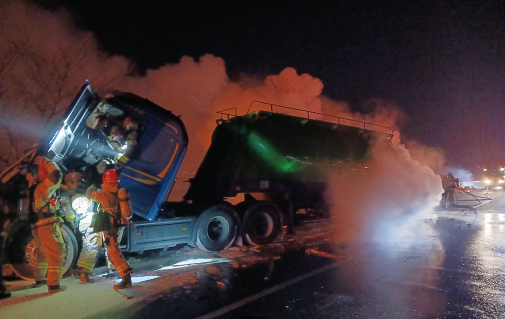 _ 15일 오전 6시 7분경 오평리 도로상… 25톤 탱크로리·6.5톤 윙바디 트럭 사고 _ 추돌 직후 차량 화재 ..