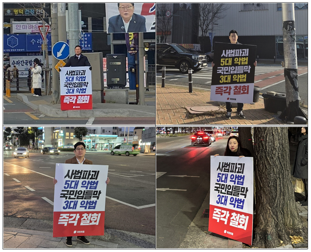 국민의힘 대구시당 관계자는 "이번 1인 피켓 시위는 단순한 정치적 구호가 아니라 민주주의의 근간을 지키기 위한 행동"이라며 "대구 시민들에게 해당 법안들의 부당성을 적극적으로 알리고, 악법 저지를 위해 끝까지 노력하겠다"고 밝혔다.