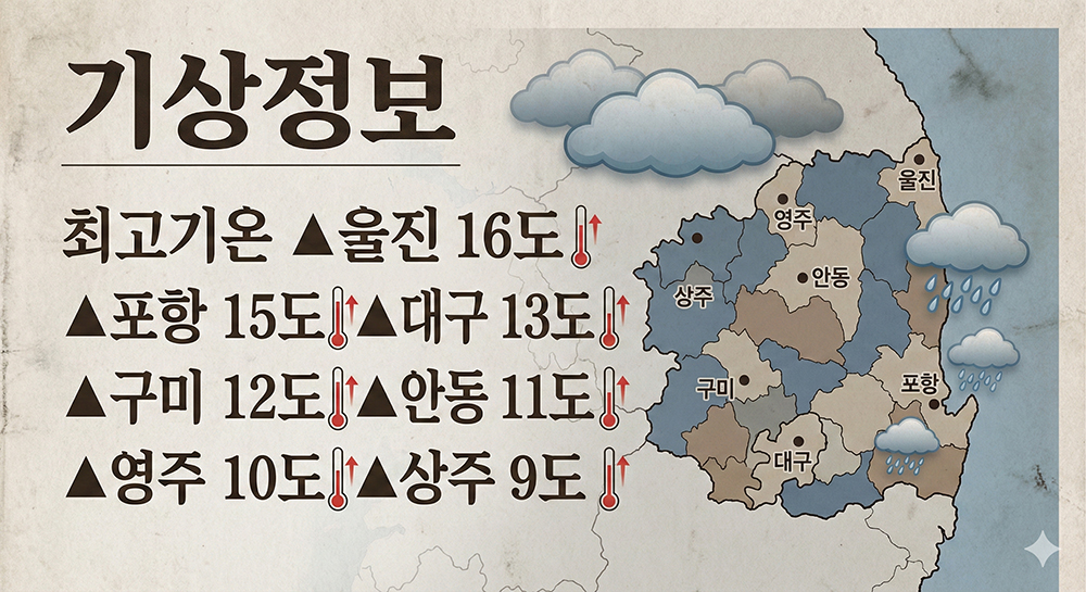 주요 지역별 아침 최저기온은 ▲봉화 -8도 ▲의성 -7도 ▲안동 -6도 ▲구미 -4도 ▲영천 -3도 ▲경주 -2도 ▲대구 -1도 ▲영덕 2도 ▲포항 3도로 관측된다. 낮 최고기온은 ▲울진 16도 ▲포항 15도 ▲대구 13도 ▲구미 12도 ▲안동 11도 ▲영주 10도 ▲상주 9도까지 오를 것으로 예상된다.