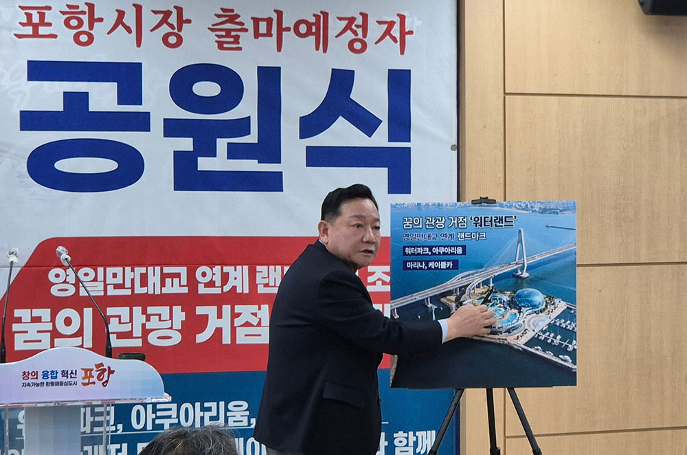 공 전 부지사는 23일 오전 10시 포항시청 브리핑룸에서 기자회견을 열고 "영일만대교 건설 시 조성되는 인공 공간에 포항의 랜드마크가 될 '워터랜드'를 조성하겠다"고 밝혔다.