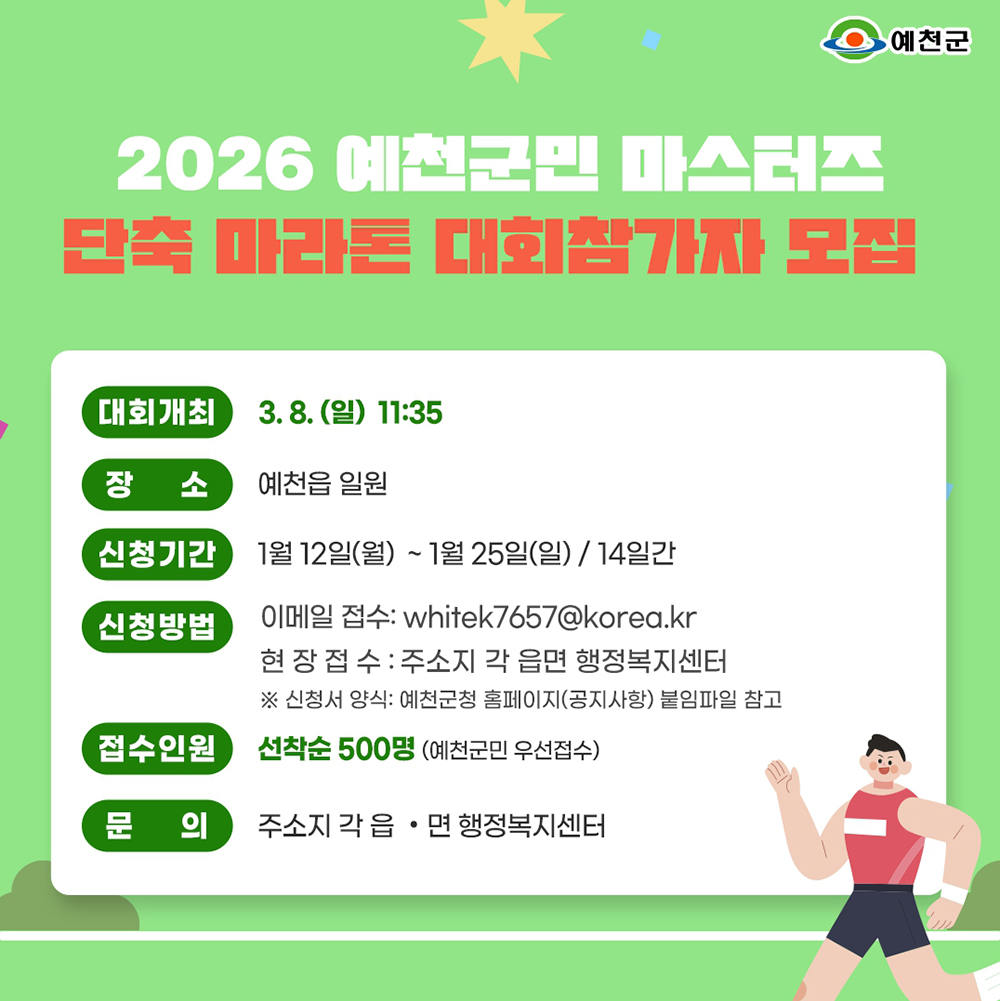 [예천(경북)=더피플매거진] 경북 예천군이 코로나19 등으로 멈췄던 군민들의 힘찬 질주를 7년 만에 다시 시작한다. 예천군은 오는 3월 8일 열리는 ‘2026 예천군민 마스터즈 단축 마라톤 대회’에 참가할 군민 500명을 선착순으로 모집한다고 12일 밝혔다.