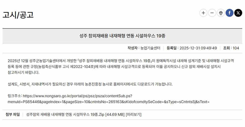 이번에 개발된 시설의 설계도, 시방서, 자재 내역서는 성주군농업기술센터 홈페이지나 농촌진흥청 농업기술포털 ‘농사로’에서 누구나 무료로 내려받아 활용할 수 있다.