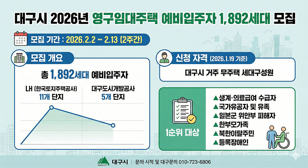 [대구=더피플매거진] 대구시가 고물가와 주거비 상승으로 신음하는 저소득 취약계층의 주거 안정을 위해 팔을 걷어붙였다. 시는 오는 2월 2일부터 13일까지 2주간 ‘2026년 영구임대주택 예비입주자’ 1,892세대를 신규 모집한다고 밝혔다.