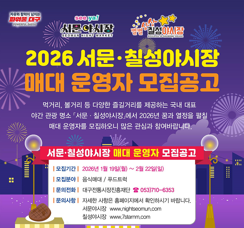 [대구=더피플매거진] 대구광역시와 대구전통시장진흥재단이 2026년 3월 말 서문·칠성야시장 개장을 앞두고 매대 운영자 52명을 공개 모집한다.