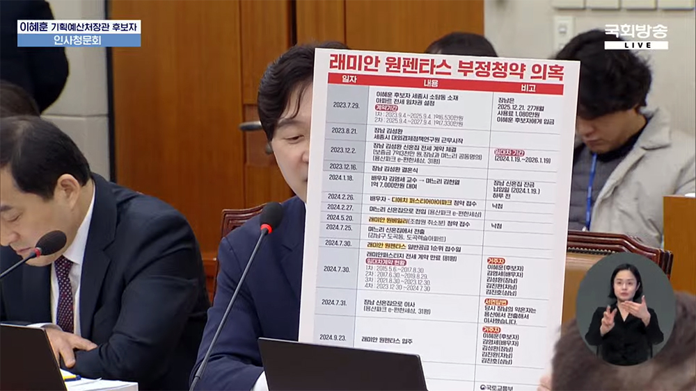 [서울=더피플매거진] 이혜훈 기획예산처 장관 후보자가 서울 서초구 반포동 '래미안 원펜타스' 청약 당첨 과정에서 불거진 '부정 청약' 및 '위장 전입' 의혹으로 거센 십자포화를 맞았다.
