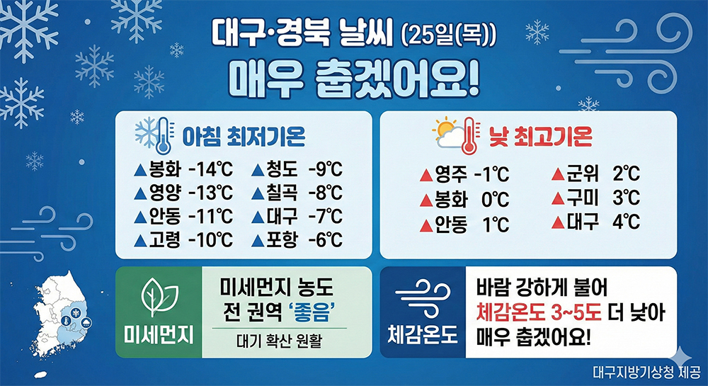 대구지방기상청은 "25일 대구·경북은 중국 북부지방에서 확장하는 찬 대륙고기압의 영향을 받아 대체로 맑다가 늦은 오후부터 구름이 많아지겠다"며 "북서쪽에서 찬 공기가 유입되면서 기온이 큰 폭으로 떨어져 매우 춥겠다"고 예보했다.