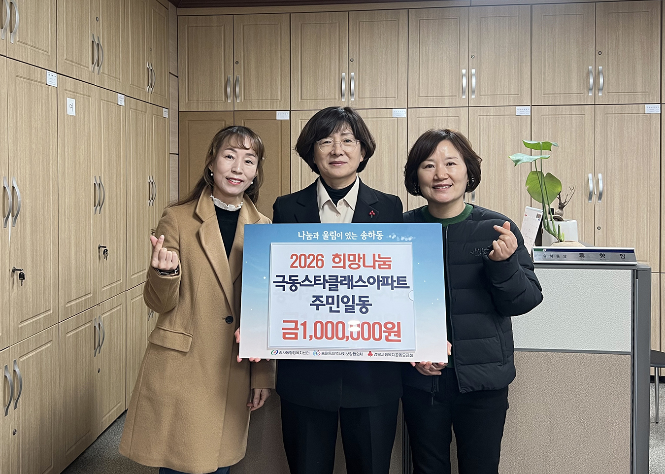 송하동에서는 주민들의 자발적 기부가 이어졌다. 지난 26일 극동스타클래스 아파트 입주민 일동이 100만 원을, 27일에는 송하동 체육회(회장 이재규)가 100만 원을 각각 기탁하며 소외된 이웃을 위한 온정을 보탰다.